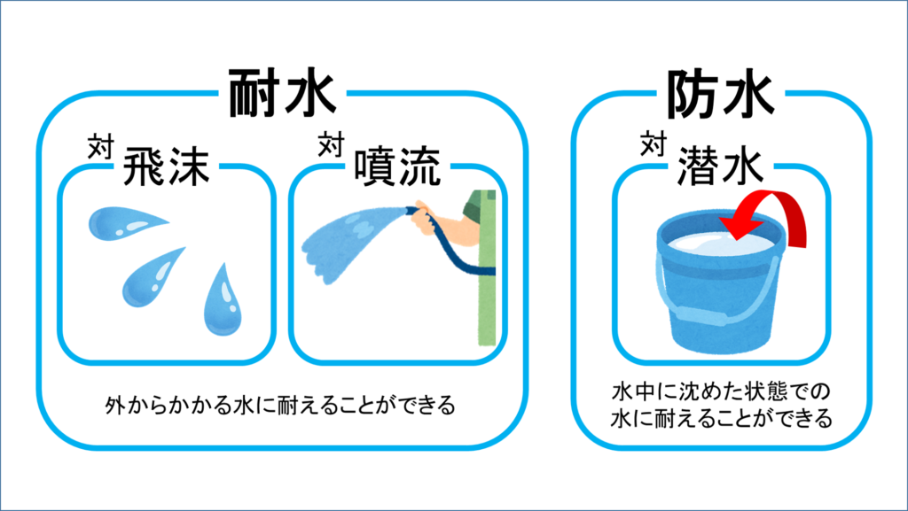 「耐水性能」とは飛沫や噴流に対する耐性のことを言うのに対し、「防水性能」とは潜水時の耐性をいいます。