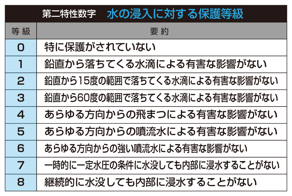 IPとはIEC規格で規定されている機器の保護構造を記号で示したもので、IPのすぐ右隣の数値は粉塵(塵や砂、埃など)に対する保護等級、一番右の数値は水の浸入に対する保護等級を表しています。