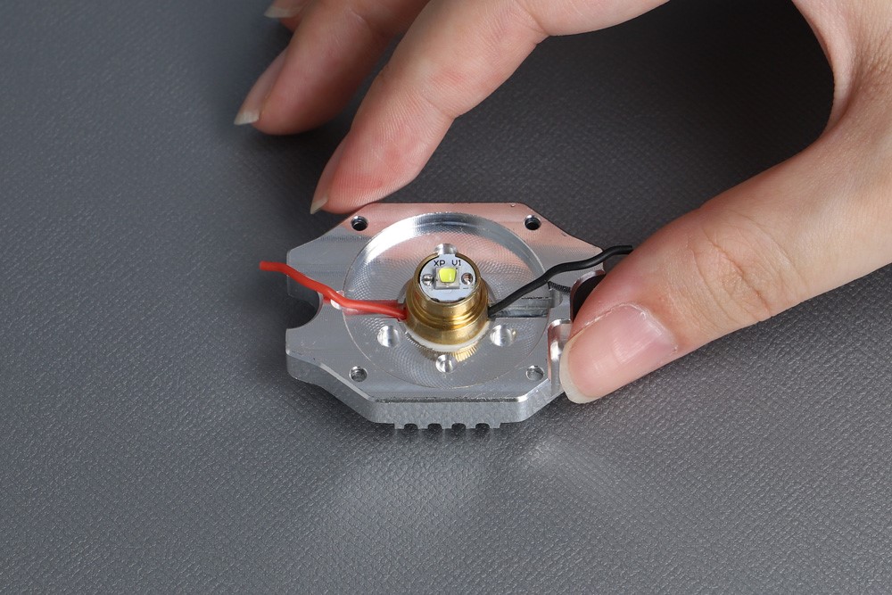 「ヒートシンク」の中央にあるLEDから電線が前の「基板」へ伸びていることがわかります。