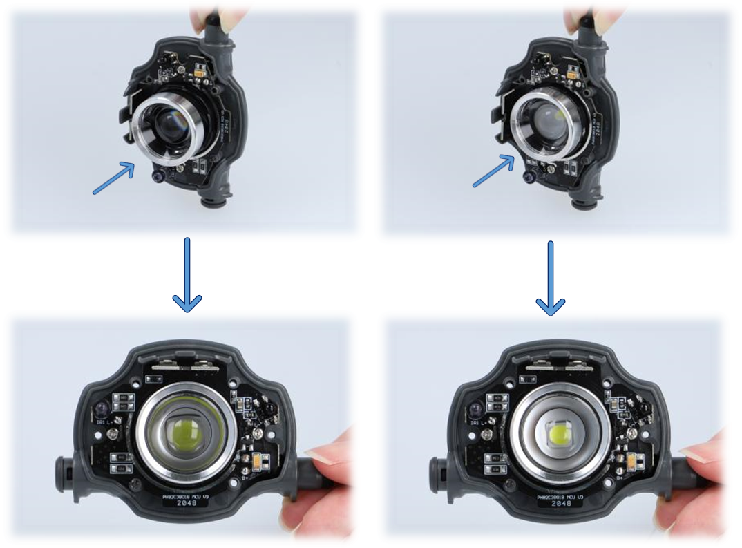 レンズが光源(LED)に遠いとスポットビーム、近いとワイドビームになります。