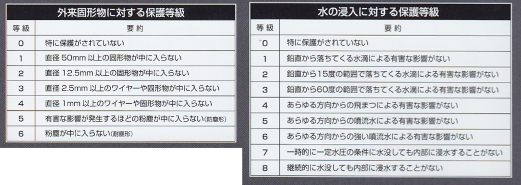 粉塵は0~6まで、水は0~8までの数字で保護等級を表しています。