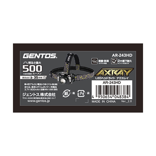 - 点灯時間(約):【白色LED】3時間(Highモード)/ 7.5時間(Midモード)/ 35時間(Ecoモード)、【赤色LED】24時間(点灯)/ 76時間(点滅)