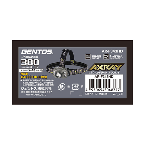 - 点灯時間(約):【白色LED】3時間(Highモード)/ 8.5時間(Midモード)/ 43時間(Ecoモード)、【赤色LED】24時間(点灯)/ 76時間(点滅)