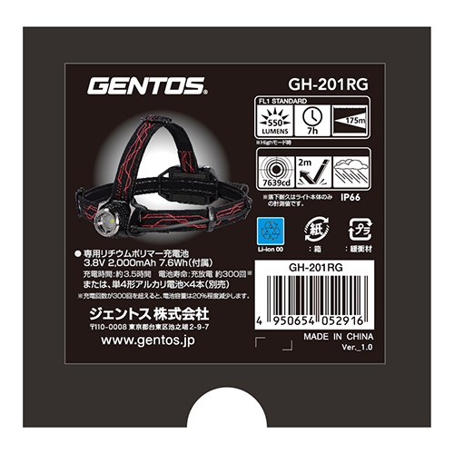 - 点灯時間(約):【ヘッド部】7時間(Highモード)/ 18時間(Midモード)/ 78時間(Ecoモード)、【後部認識灯】200時間(点灯)/ 200時間(点滅)