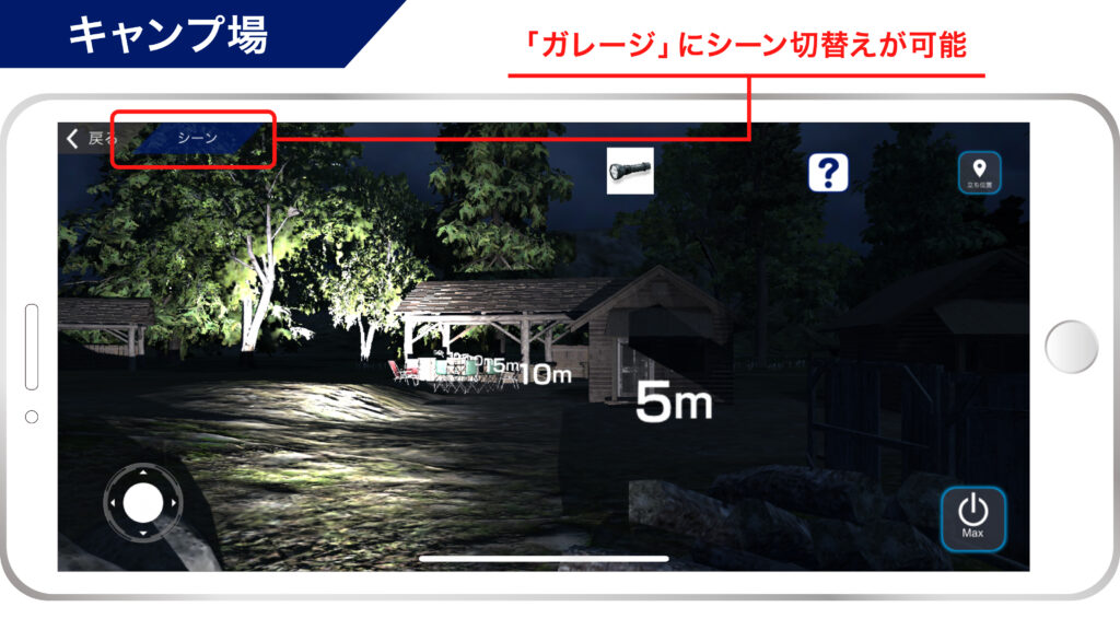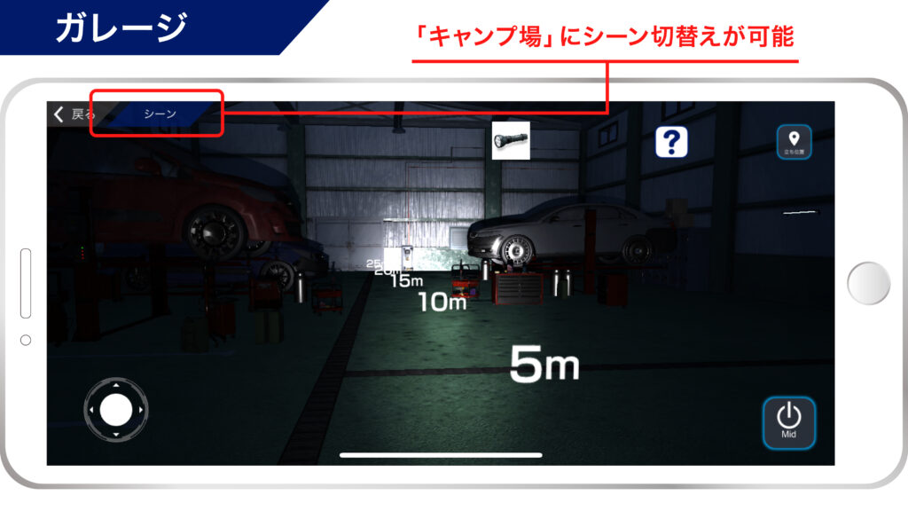 『GENTOS Light Shooter』は、ジェントスのライト(フラッシュライト、ヘッドライト、ワークライト)を点灯させた際の使用イメージをCG空間で確認できるスマートフォン専用アプリです。