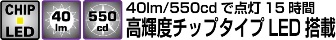 高輝度チップタイプ白色LEDを1灯搭載。単4x3本で40lm、点灯時間15時間を実現。