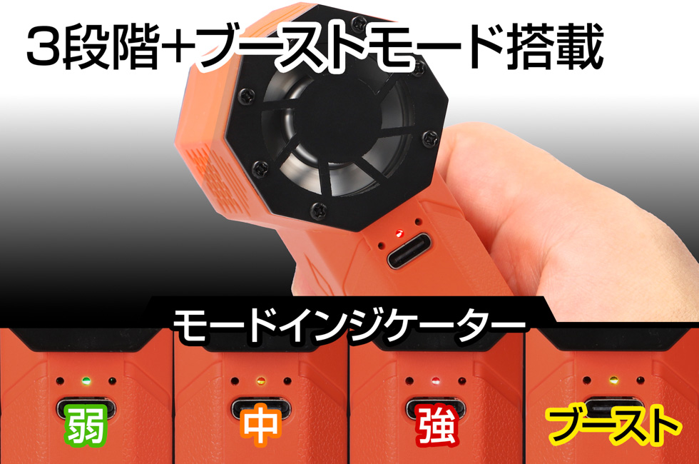 - Wind speed:14 m/s(Minimum)/ 30 m/s(Middle) / 45 m/s(Maximum) / 54 m/s(Boost)※Long press the switch