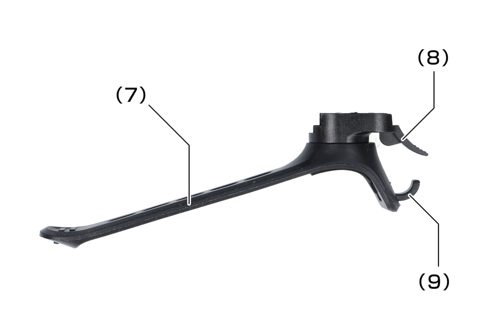 (7) ラバーブラケット(対応ハンドル径:φ19~33mm) (8) ロック解除レバー (9)バンドフック