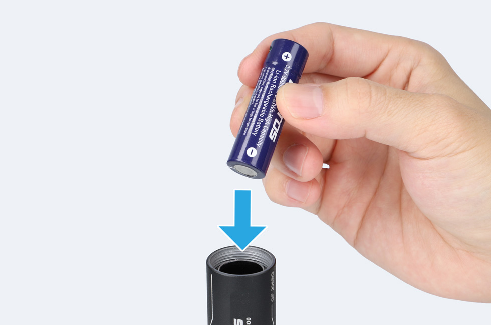 専用充電池のマイナス側からライト本体へ入れ、テールキャップをしっかりしめる