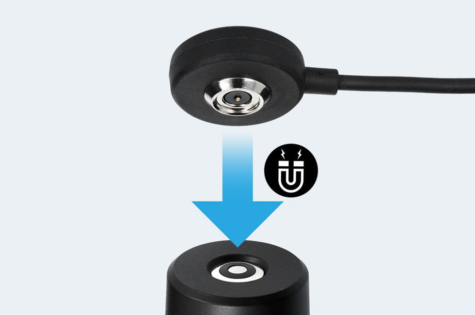 専用充電池が本体に入っていることを確認してから、下図のように付属のマグネットチャージングケーブルと専用ACアダプターを使用し、充電してください。充電が開始されるとチャージングインジケーターが点灯します。