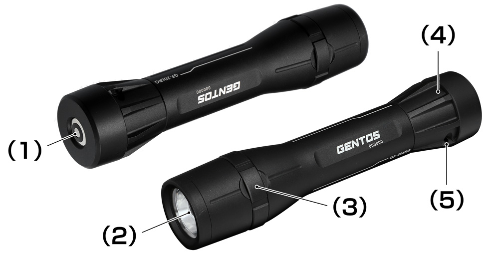 (1)スイッチ (2)白色LED (3)フォーカスリング (4)テールキャップ (5)ストラップ穴