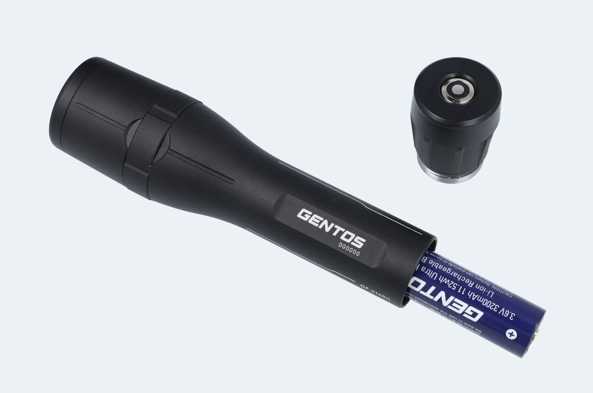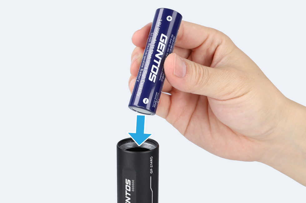 専用充電池をマイナス側からライト本体に入れ、テールキャップをしっかりしめる