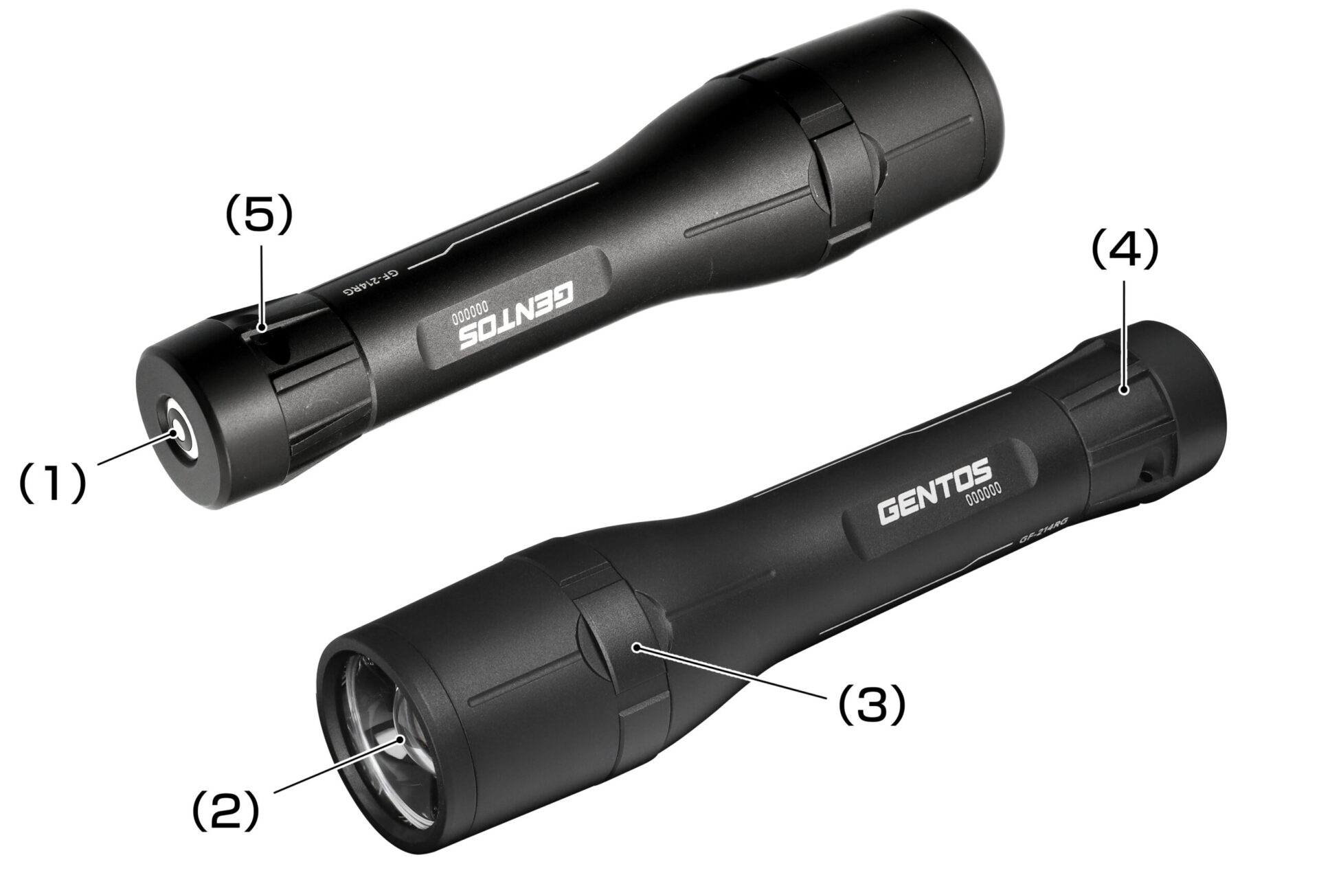 (1) スイッチ (2) 白色LED (3) フォーカスリング (4) テールキャップ (5) ストラップ穴