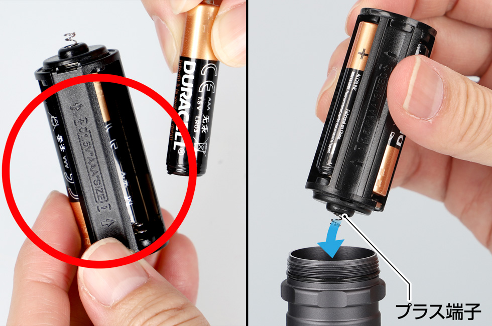 バッテリーカートリッジはプラス端子側からライト本体へ入れ、テールキャップをしっかりしめる