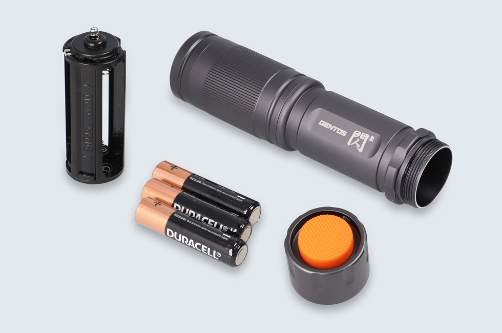 テールキャップを開け、バッテリーカートリッジと乾電池を取り出す