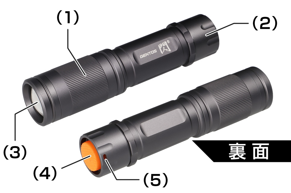 (1) ヘッド部 (2) テールキャップ (3) 白色LED (4) スイッチ (5) ストラップ穴
