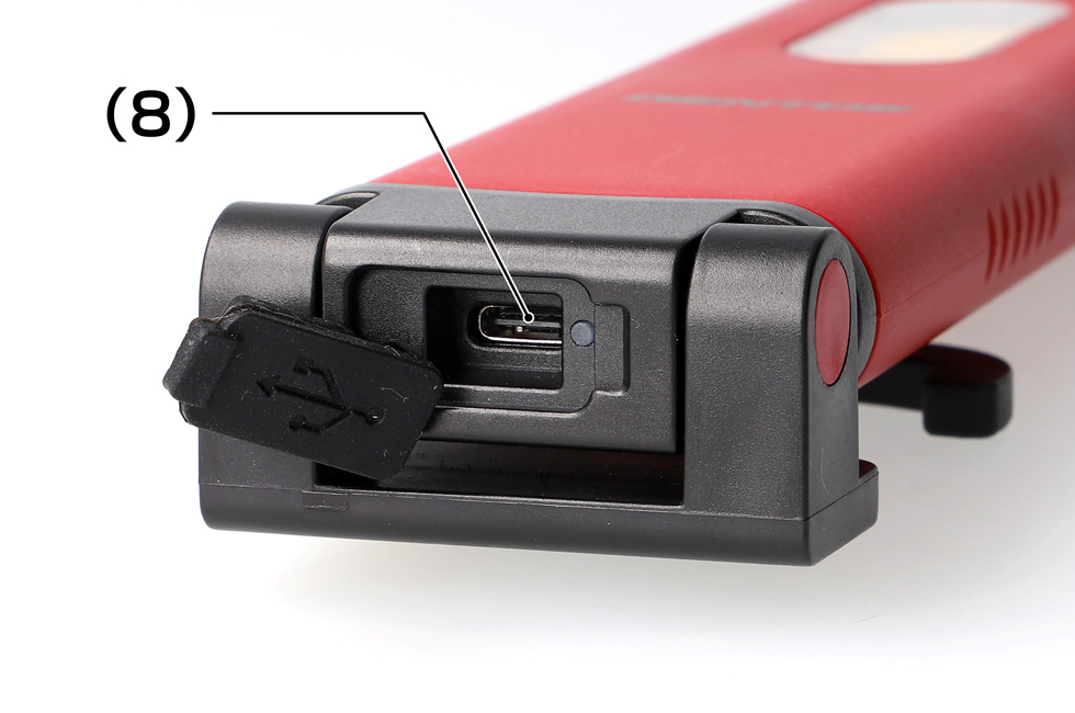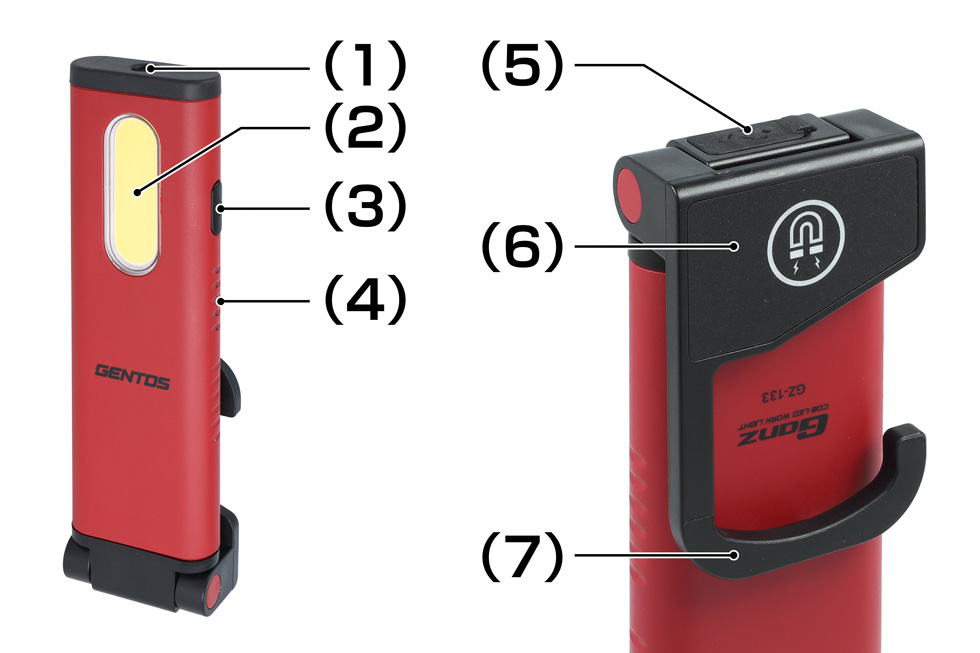 (1) トップライト (2) メインライト (3) スイッチ (4) チャージングインジケーター / バッテリーインジケーター (5) USB Type-Cポートカバー (6) マグネット (7) 背面マグネット付きフックスタンド