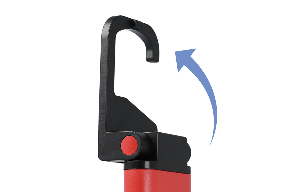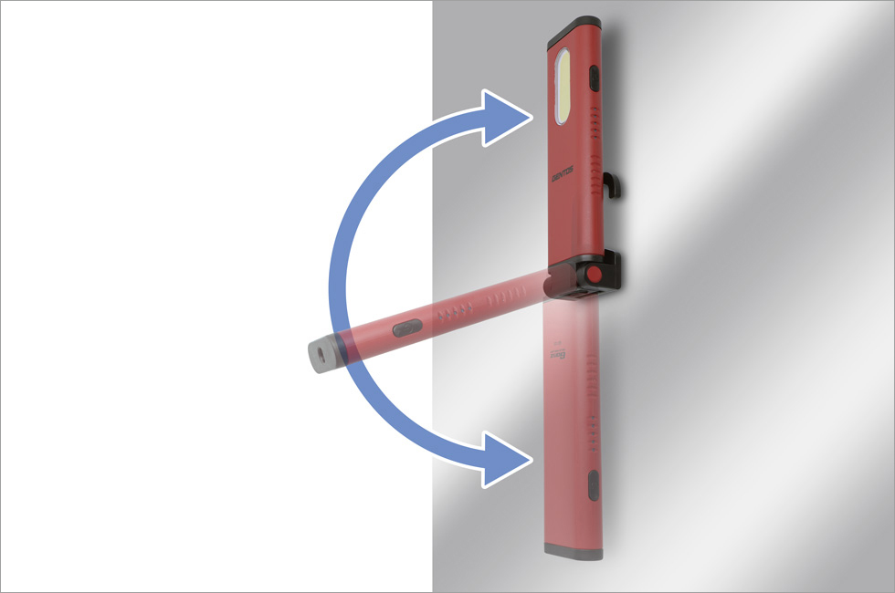 鉄面に貼り付け可能なマグネットと引っ掛けて使用できるフック、さらに本体を立てられるスタンドとしても使用可能。可動式だから、照射したい場所に自由に向きを変えることができる。