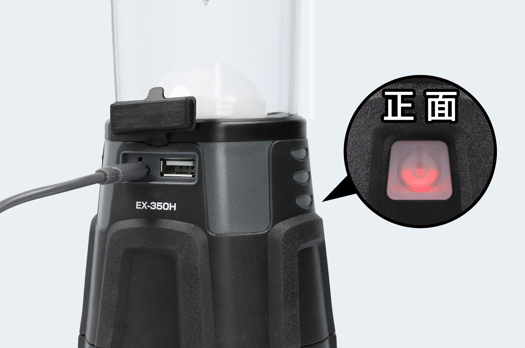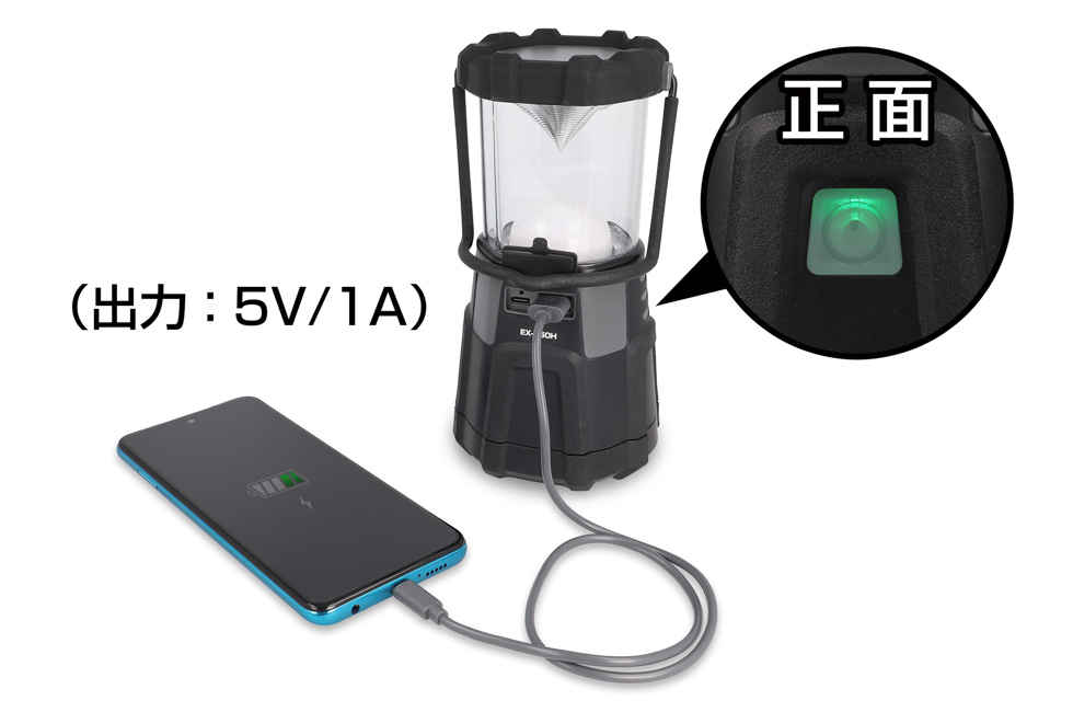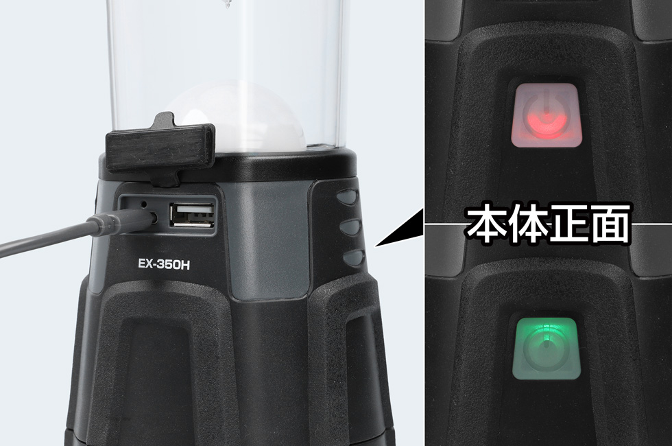 ランタン本体を使用して充電する際はUSBポートカバーを開け、付属のUSB Type-Cケーブルで充電してください。充電が開始されるとチャージングインジケーターが点灯します。