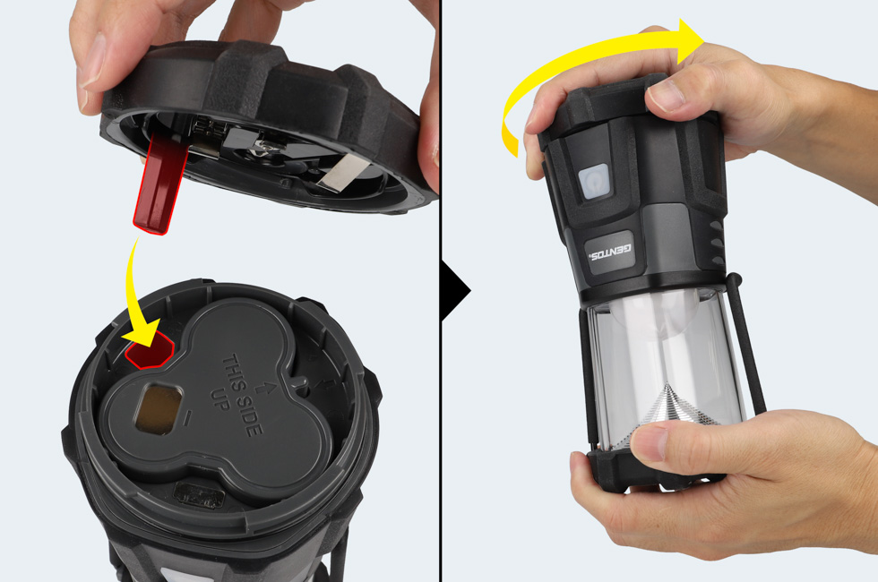 ランタン本体から専用充電池を取り出し、USB Type-Cコネクタを直接差し込んでください。