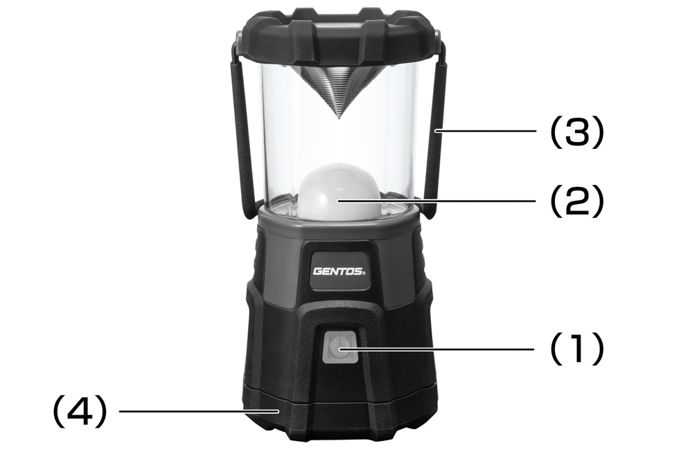 (1) スイッチ / インジケーター (2) LED (3) キャリングハンドル (4) 電池蓋 (5) ビルトインフック