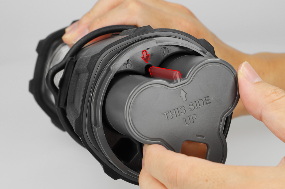 | ●乾電池は別売です。 ●乾電池は⊕⊖の方向を正しく入れてください。 ●使い切った乾電池は本体から取り出してください。 ●長期間使用しない場合は、本体から乾電池を取り出して保管してください。乾電池の液漏れ、破壊などを起こし周囲を汚損する原因になります。 ●新旧・異種の乾電池を混用しないでください。 ●乾電池、および市販の単1形充電池は充電することはできません。 ●乾電池挿入時は充電しないでください。 |