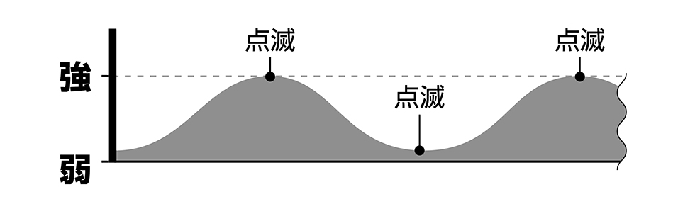 各モードでスイッチを長押しすると無段階で明るさの調節が可能。長押し中は弱から強、強から弱へ調光を繰り返します。