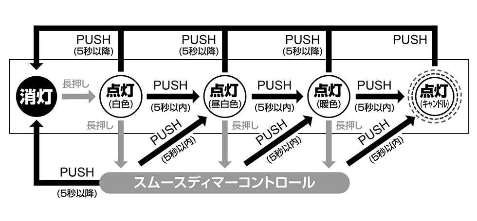 | ※スムースディマーコントロール(無段階調光機能)実行から5秒以内にスイッチを押すとモードが切り替わります。 |