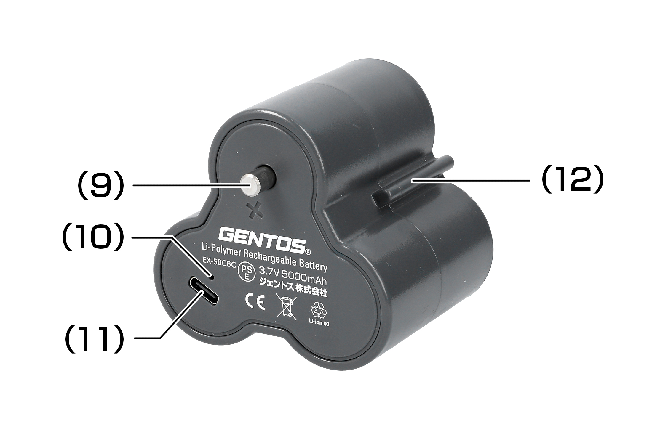 (9) プラス端子 (10) チャージングインジケーター (11) USB Type-Cポート(充電用) (12) ガイドレール