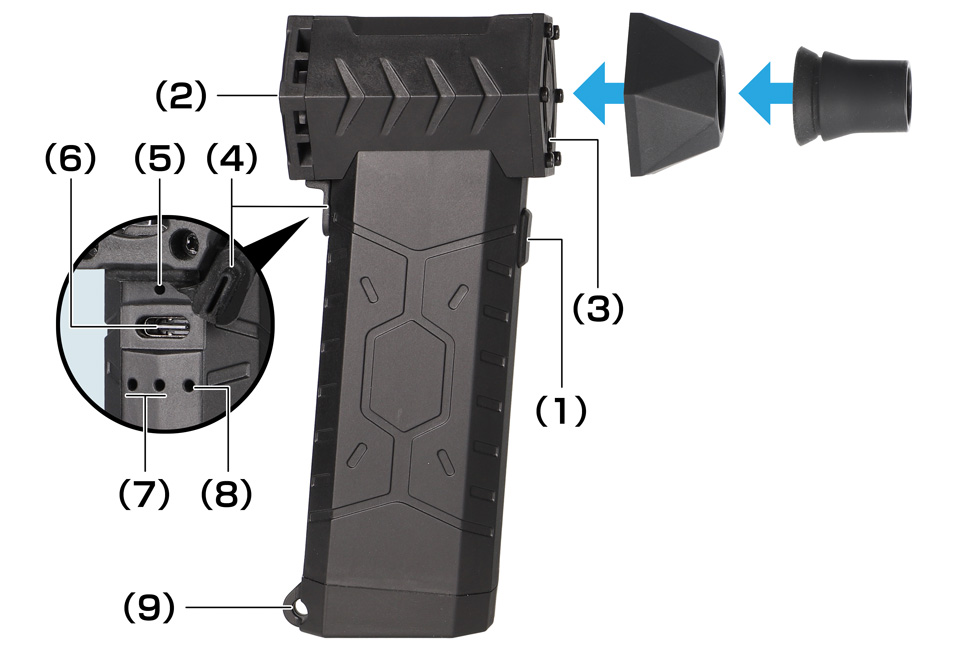 (1) スイッチ (2) 吸入口(回転部) (3) 送風口 (4) USB Type-Cポートカバー (5) チャージングインジケーター (6) USB Type-Cポート (7) 風量インジケーター (8) バッテリーインジケーター (9) ストラップ穴