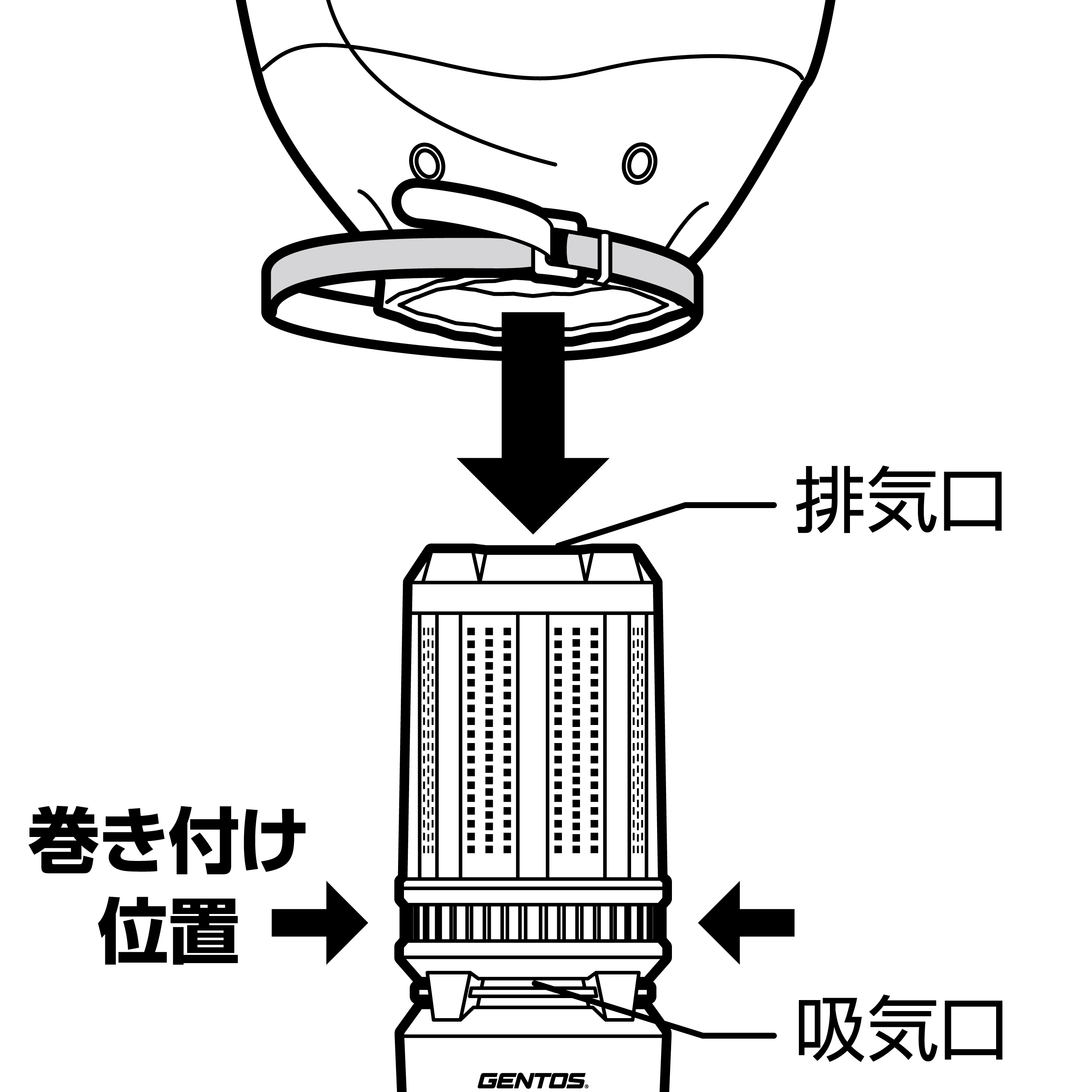 | バルーンで吸気口を塞いでいる。 | ライトユニットのバルーン巻き付け位置でバルーンを固定してください。 |