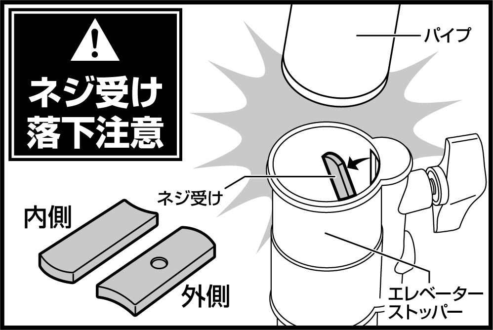 【注意!】パイプの高さ調整時、エレベーターストッパーからパイプが抜ける恐れがありますので、過度な力で引っ張らないでください。またパイプが抜けた際に、エレベーターストッパー内部のネジ受けがパイプ内に落下する場合があります。必ずネジ受けを元の位置に戻してからパイプを戻してください。