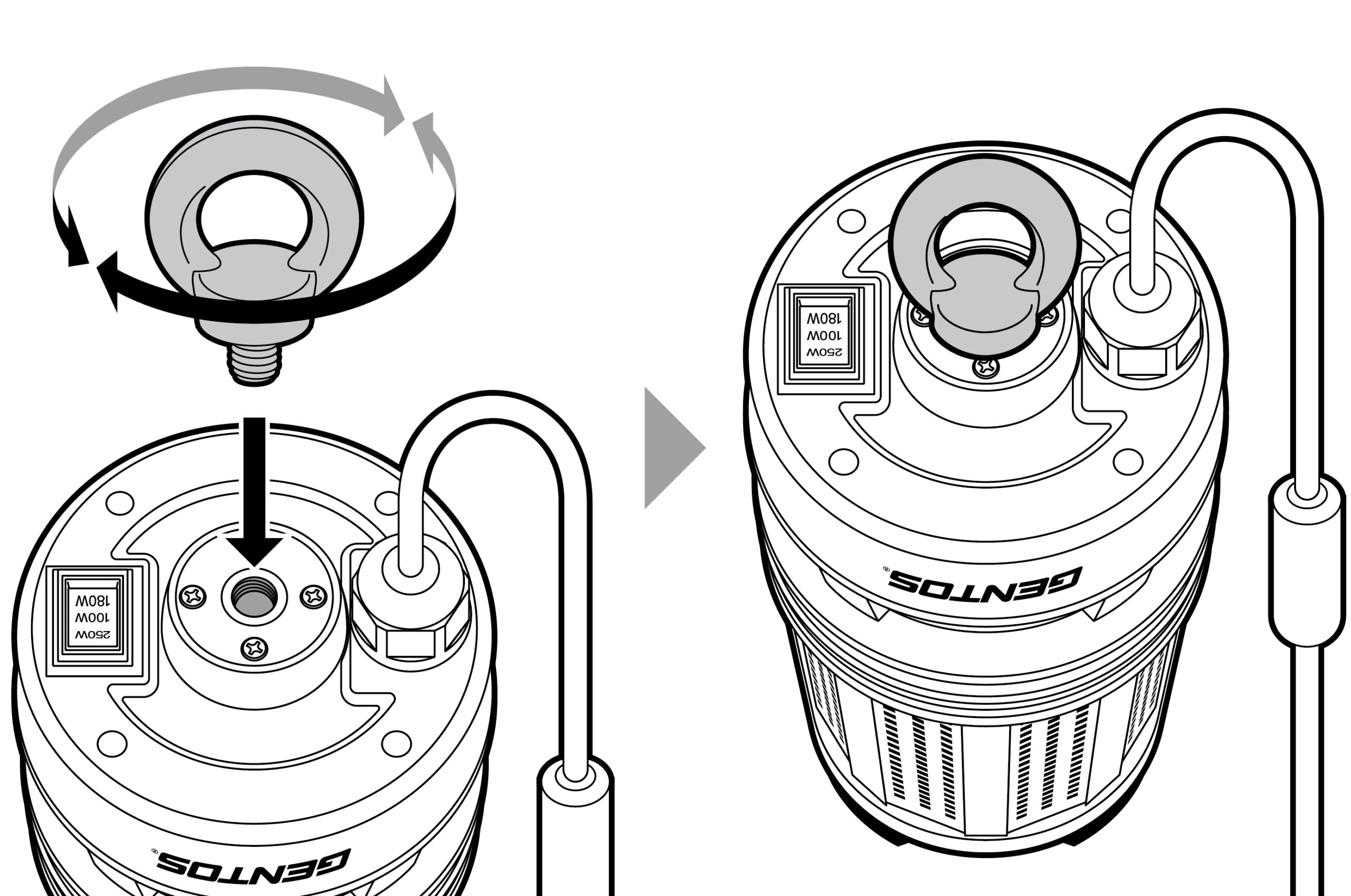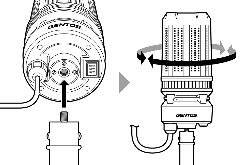 三脚上部のねじにライトユニットのアイボルト取り付け用穴を合わせて付けます。