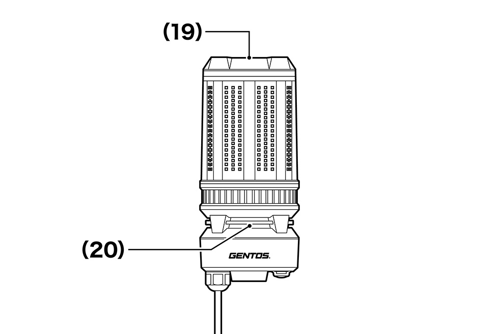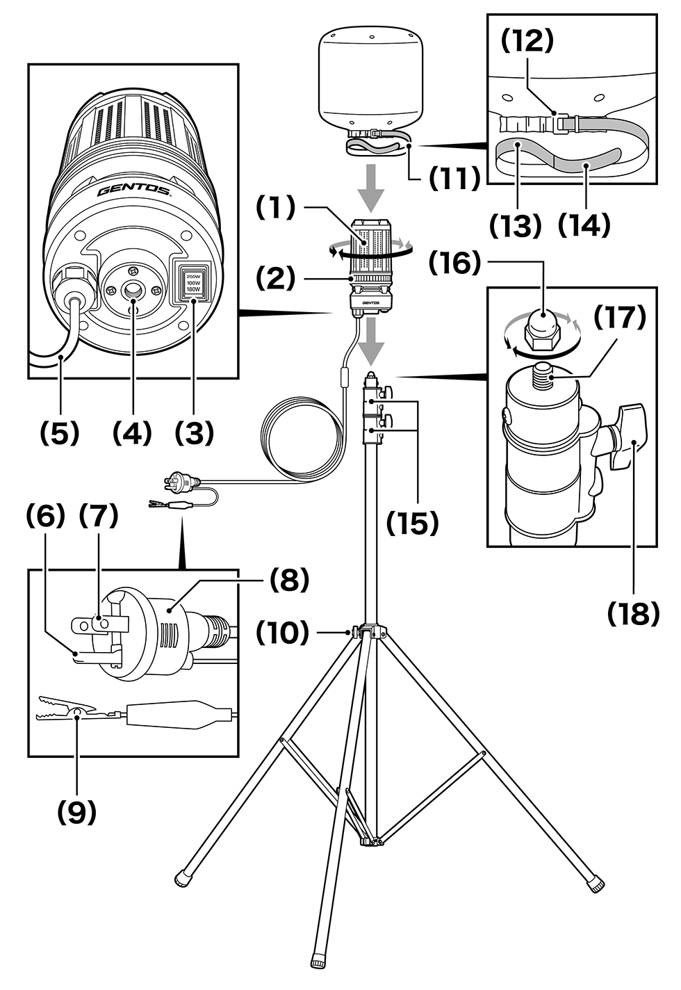 (1) 白色LED (2) バルーン巻き付け位置 (3) 明るさ切り替えスイッチ (4) アイボルト取り付け用穴 (5) 電源コード (6) 接地ピン (7) 刃 (8) 電源プラグ (9) みのむしクリップ (10) 三脚固定ボルト (11) バルーン固定用面ファスナー (12) バックル (13) 面ファスナー ループ面 (14) 面ファスナー フック面 (15) エレベーターストッパー (16) 六角袋ナット (17) ライトユニット固定用ねじ (18) 高さ調節ボルト