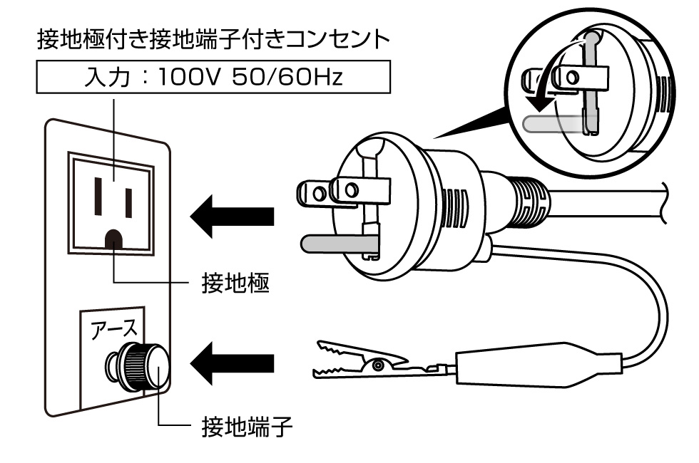 電源プラグの接地ピンを立ち上げ、接地極付きコンセントにつなぐと自動的に点灯します。接地極がない環境の場合は、みのむしクリップを接地端子へ接続してください。