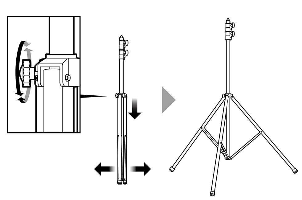 1.三脚固定ボルトを緩め、三脚を両手で2本持ち、広げる。