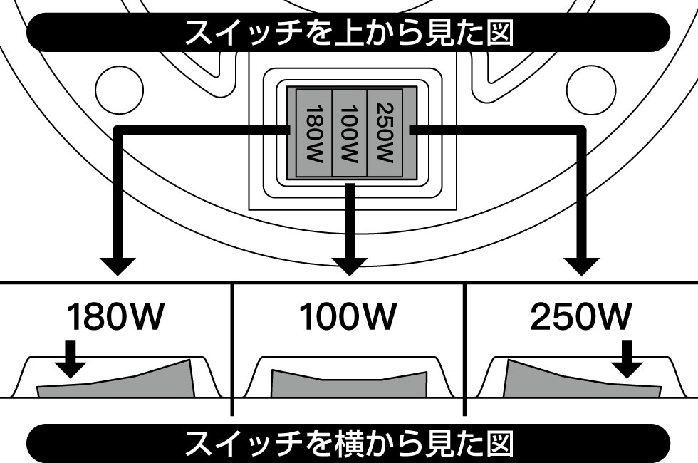 ライトユニットの明るさ切り替えスイッチを下図のように押すと明るさが切り替わります。