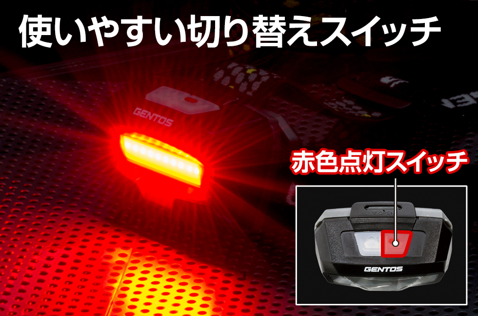 • 赤色点灯:暗い場所で手元を照らすなど、メインLEDでは明るすぎる際に便利。