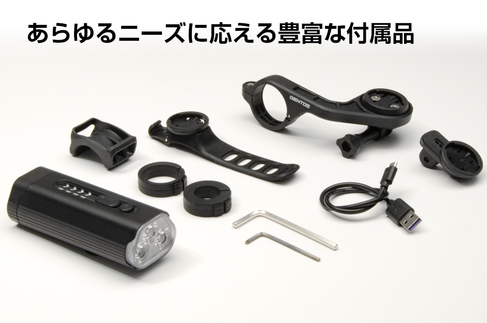 - 付属品:アウトフロントブラケット、アウトフロントブラケット用アジャストラバー×2種、ライトアダプター、ラバーブラケット、ラバーブラケット用アジャストラバー、Micro USBケーブル(33cm)、六角レンチ×2種