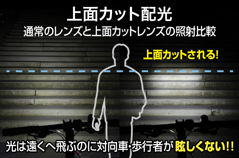 - 上面カット配光:光は遠くへ飛ぶのに対向車・歩行者が眩しくない。StVZO規格準拠。