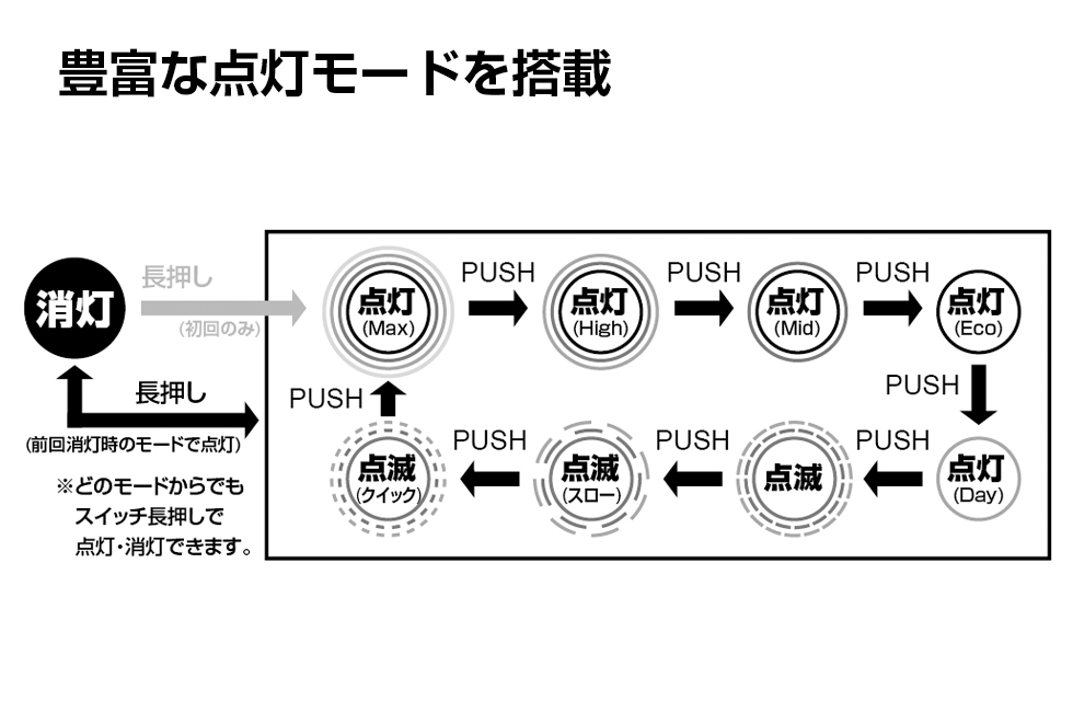 - 点灯時間(約):1時間(Maxモード)/ 2時間(Highモード)/ 3時間(Midモード)/ 7時間(Ecoモード)/ 35時間(Day Lightモード)/ 10時間(点滅)/ 10時間(スロー点滅)/ 50時間(クイック点滅)