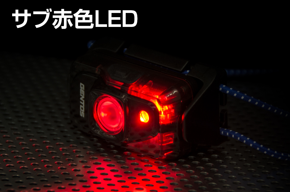 - 赤色サブLED:暗い場所で手元を照らすなど、メインLEDでは明るすぎる際に便利。