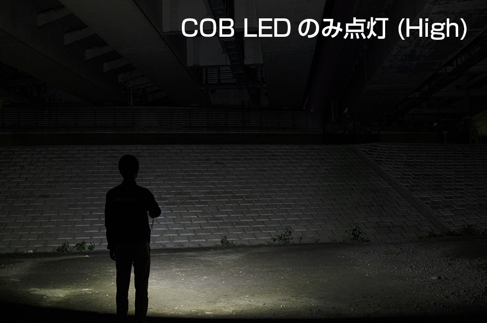 - 明るさ(約):650ルーメン(全ライト点灯時)/ 400ルーメン(チップタイプLED点灯時)/ 110ルーメン(COB LED Ecoモード時)/ 270ルーメン(COB LED Highモード時)