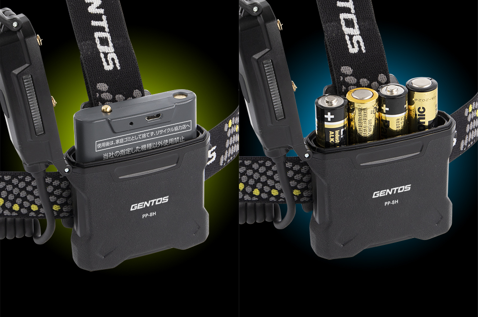 - 【ヘッド部】ヘッドプッシュスイッチ、【電池ボックス部】ヘッドプッシュスイッチ