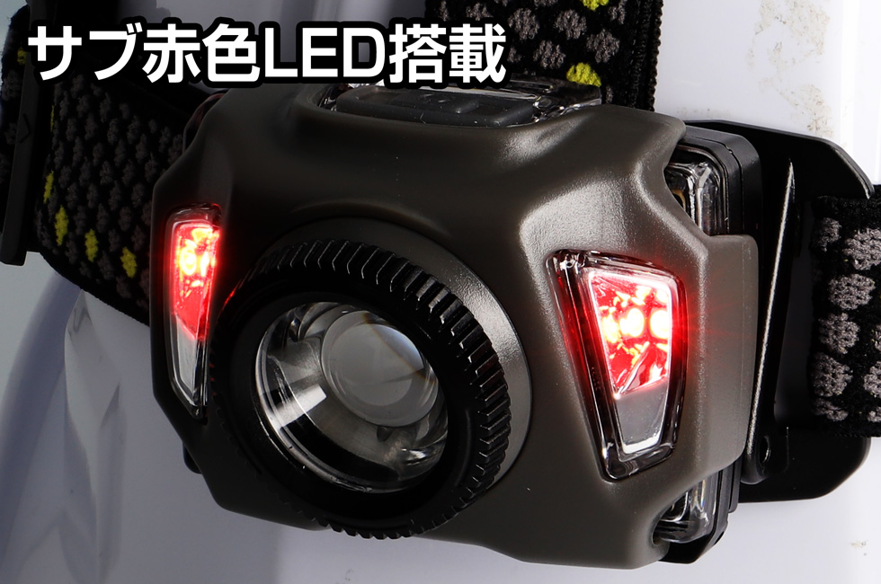 - 赤色サブLED:暗い場所で手元を照らすなど、メインLEDでは明るすぎる際に便利。