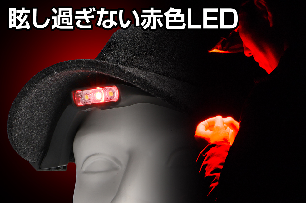 - 赤色LED:暗い場所で手元を照らすなど、メインLEDでは明るすぎる際に便利。
