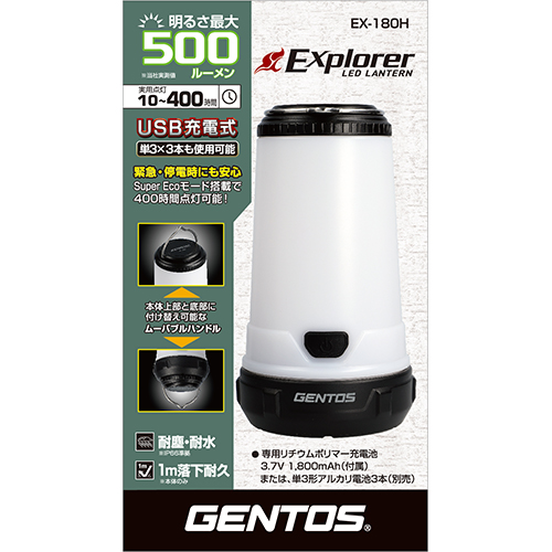 - 明るさ(約):500ルーメン(Highモード時)/ 200ルーメン(Midモード時)/ 20ルーメン(Ecoモード時)/ 5ルーメン(Super Ecoモード時)