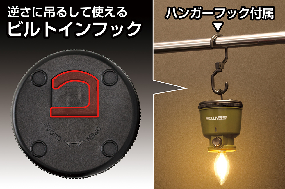 - ビルトインフック:カバー部分を外し、逆さまに吊るして使用可能。