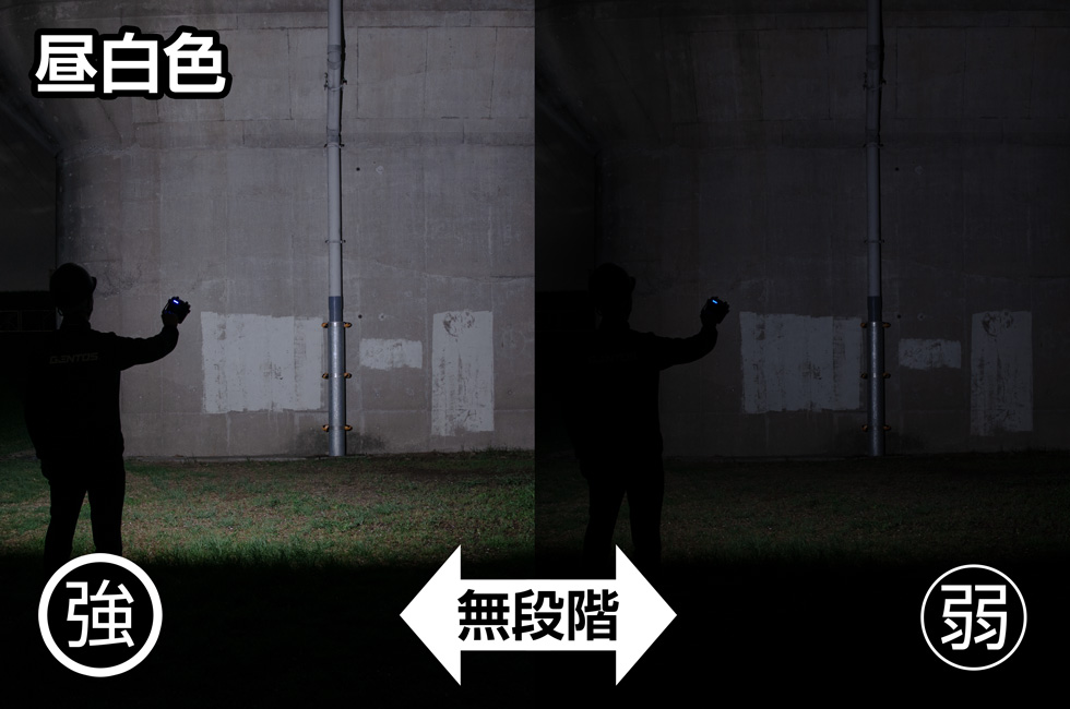 - 無段階調光機能:ダイヤルを回して弱~強まで無段階に調光可能。