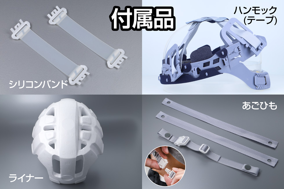 - 部品詳細:帽体、衝撃吸収ライナー、ハンモック(テープ)、耳ひも2本、ワンタッチあご紐